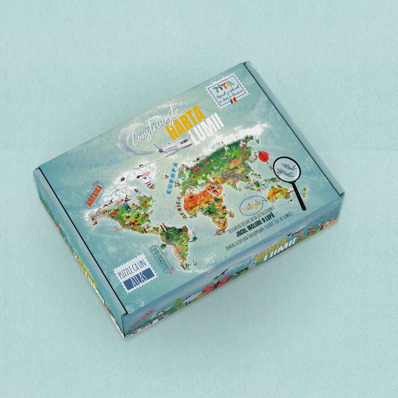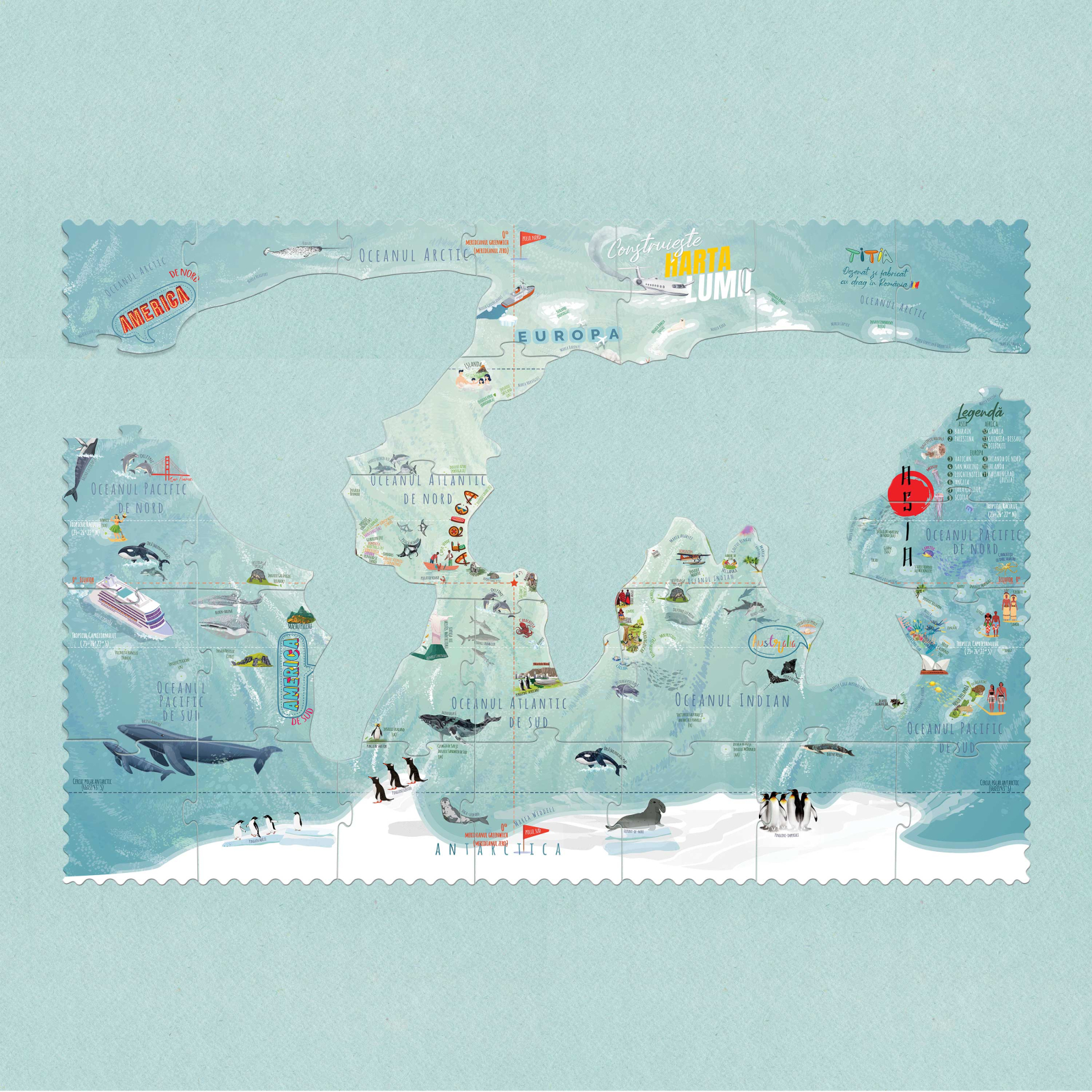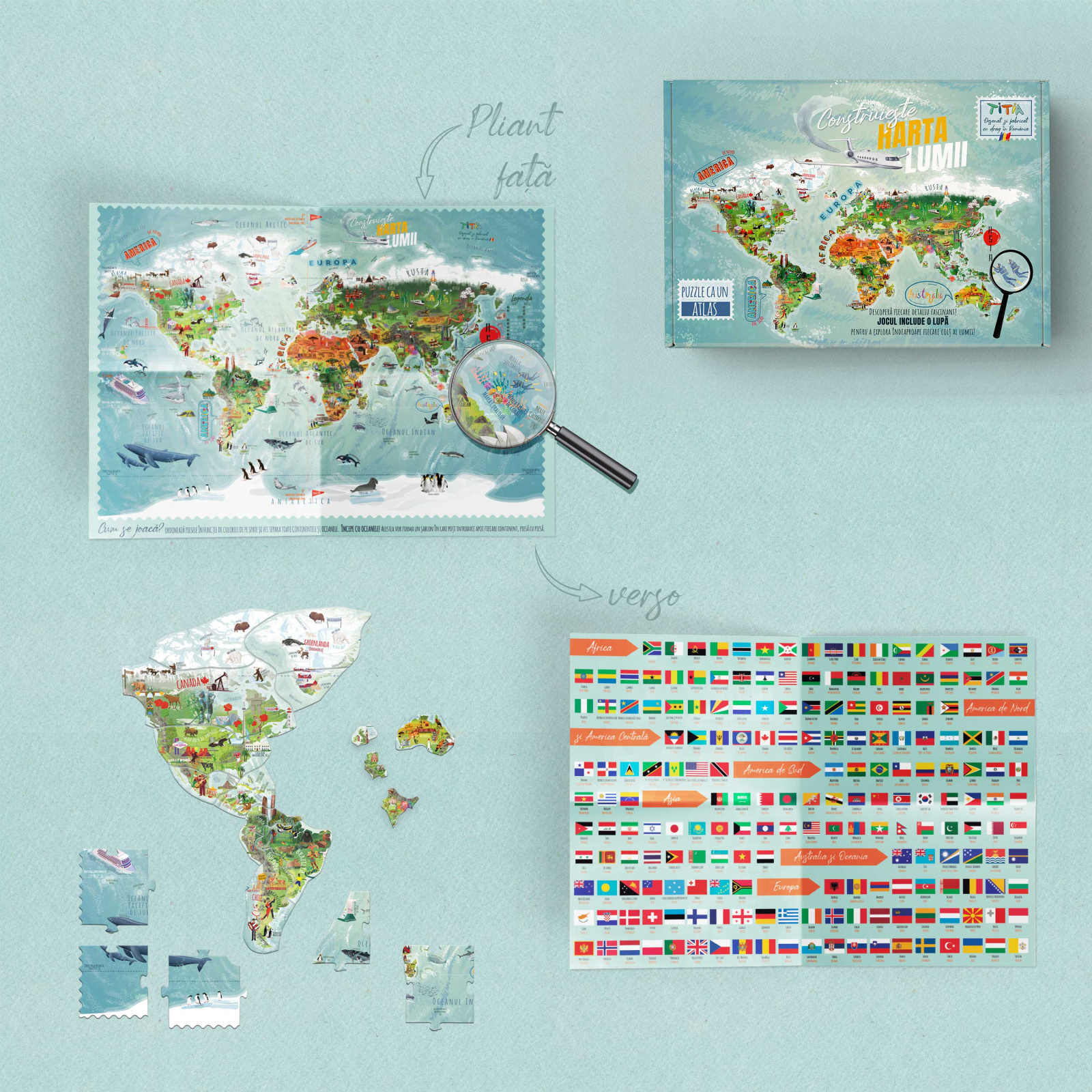 - Puzzle Mare (0.7 m x 0.5 m) cu 7 grupuri de piese (Oceane + 6 Continente) - TOTAL 74 piese, unele în formă clasică, de puzzle, și unele pe granița țărilor
