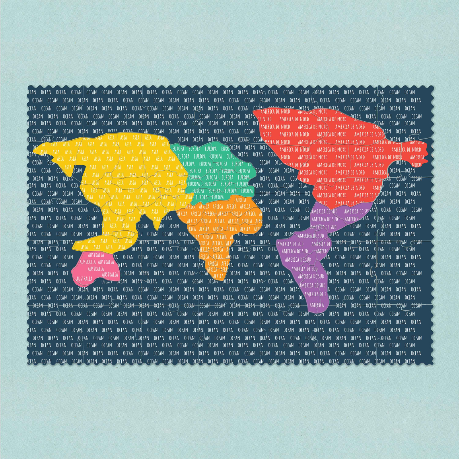 Începe cu Oceanele! Acestea vor forma un șablon în care apoi poți introduce fiecare continent, pe rând, piesă cu piesă.