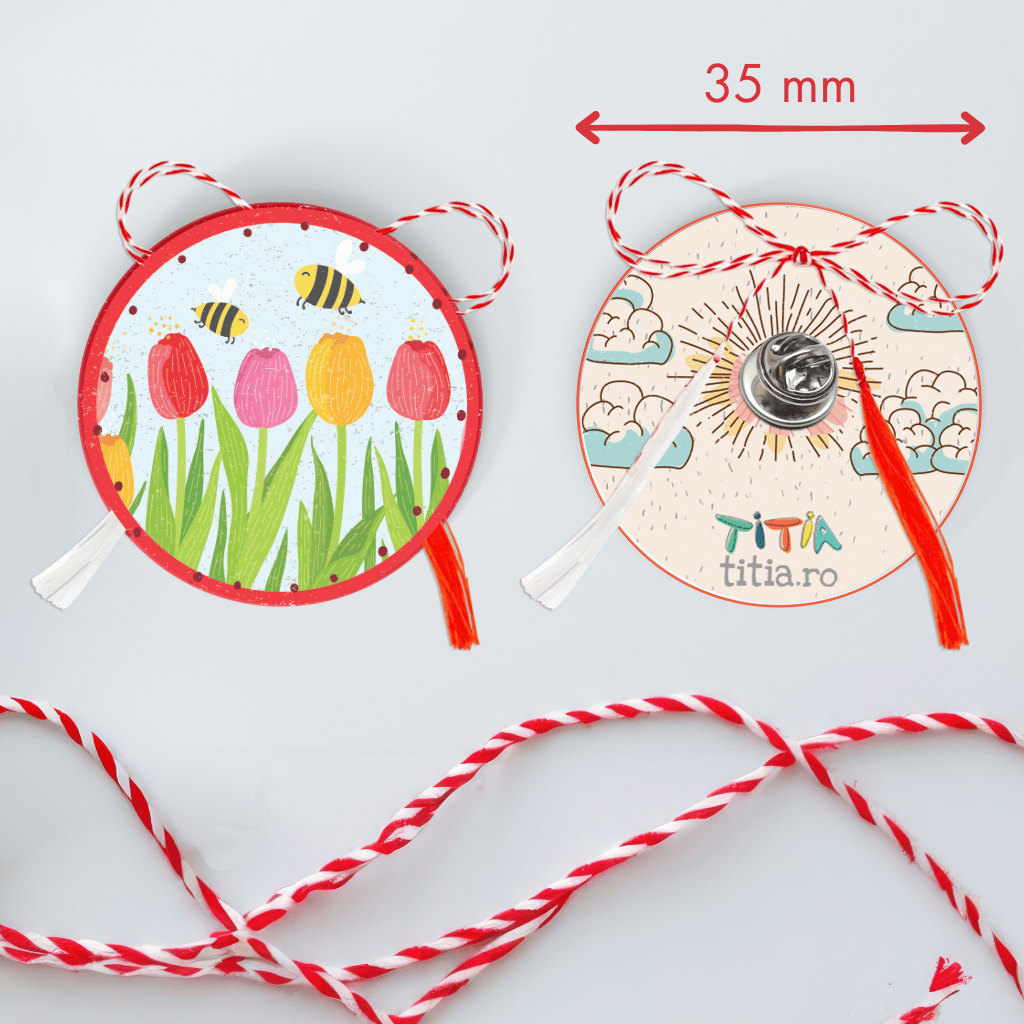 Mărțișoarele noastre sunt realizate din carton rezistent, frumos ilustrat, și prinse cu un ac metalic cu protecție pentru copii, împreună cu tradiționala ață a mărțișorului. Măsoară 37 mm în diametru, fiind perfecte pentru a fi purtate cu drag în această perioadă specială.