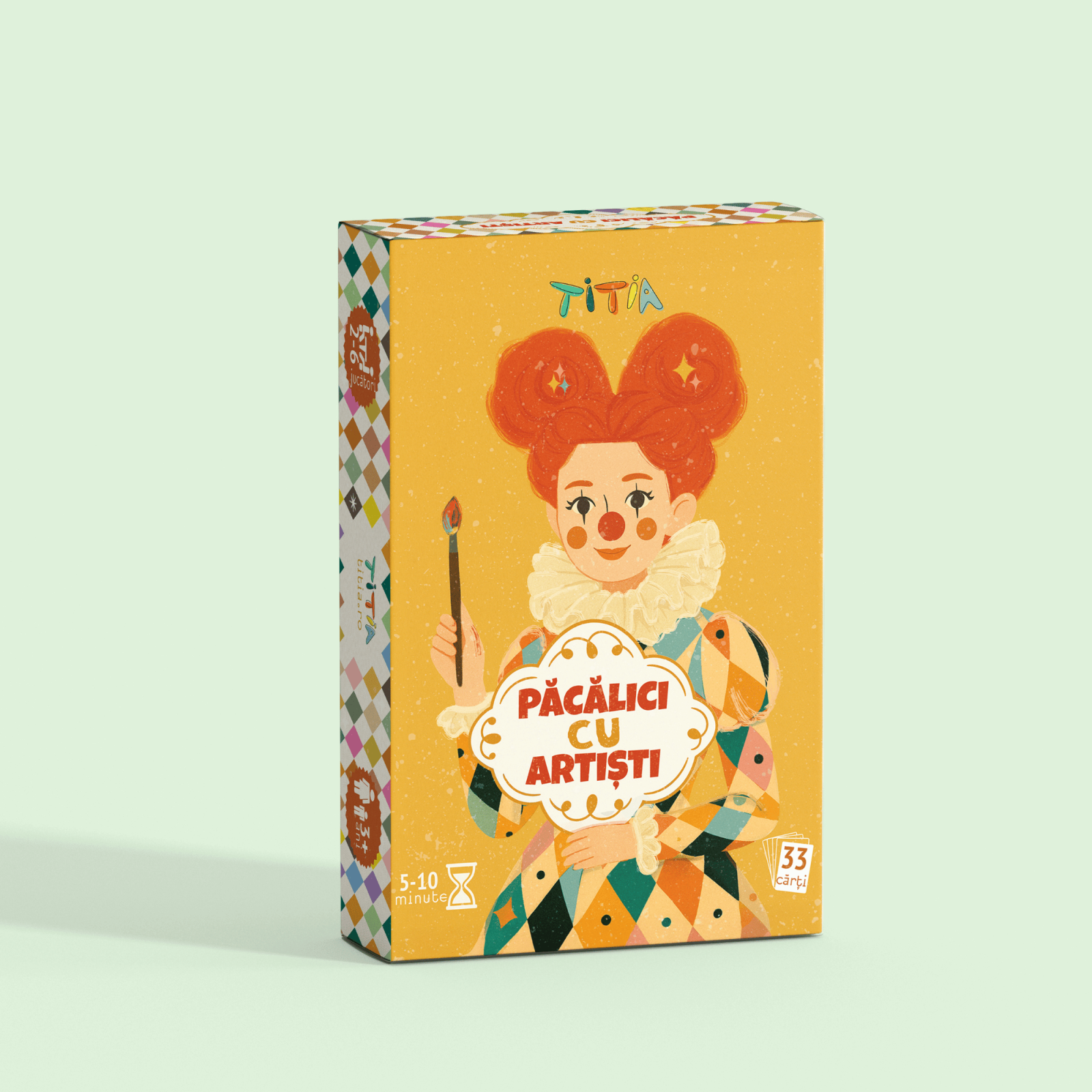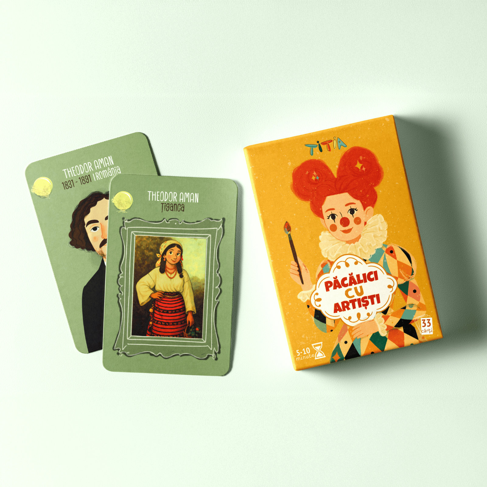 Un pachet de 33 de cărți: 16 perechi formate din pictori români și străini și operele lor reprezentative, plus Păcăliciul și instrucțiuni.